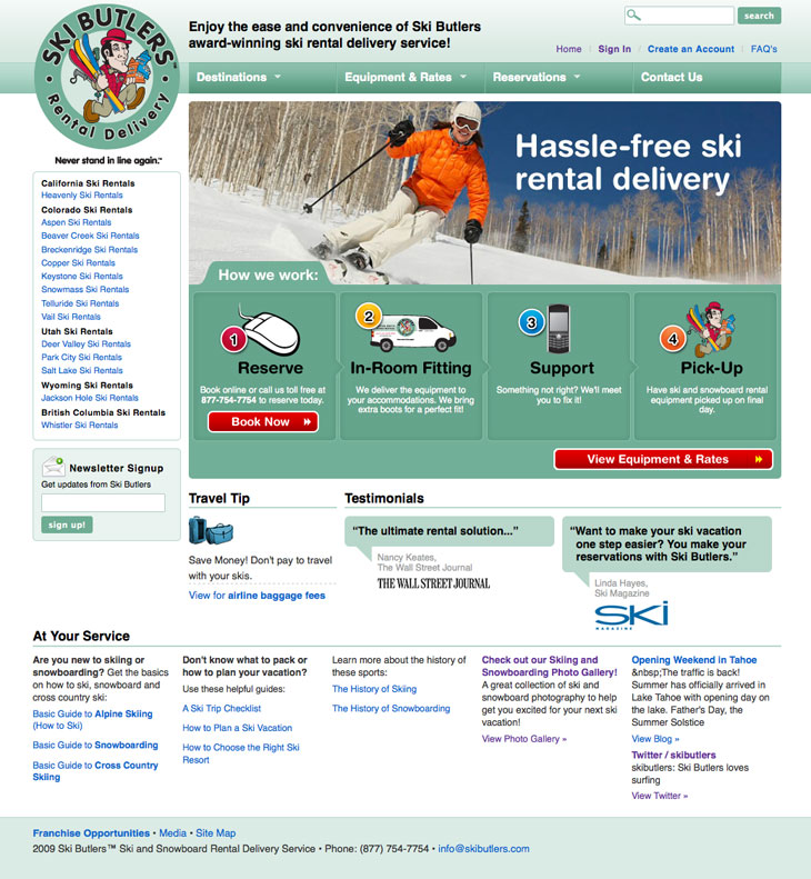 About this project: Ski Butlers is a Ski Rental delivery Service based in Park City, Utah designed to take the stress out of your ski vacation. The redesigned site had to be appropriately stress-free, clean and easy to operate. It also had to be structurally overhauled to improve Ski Butlers' Search Engine Optimization.